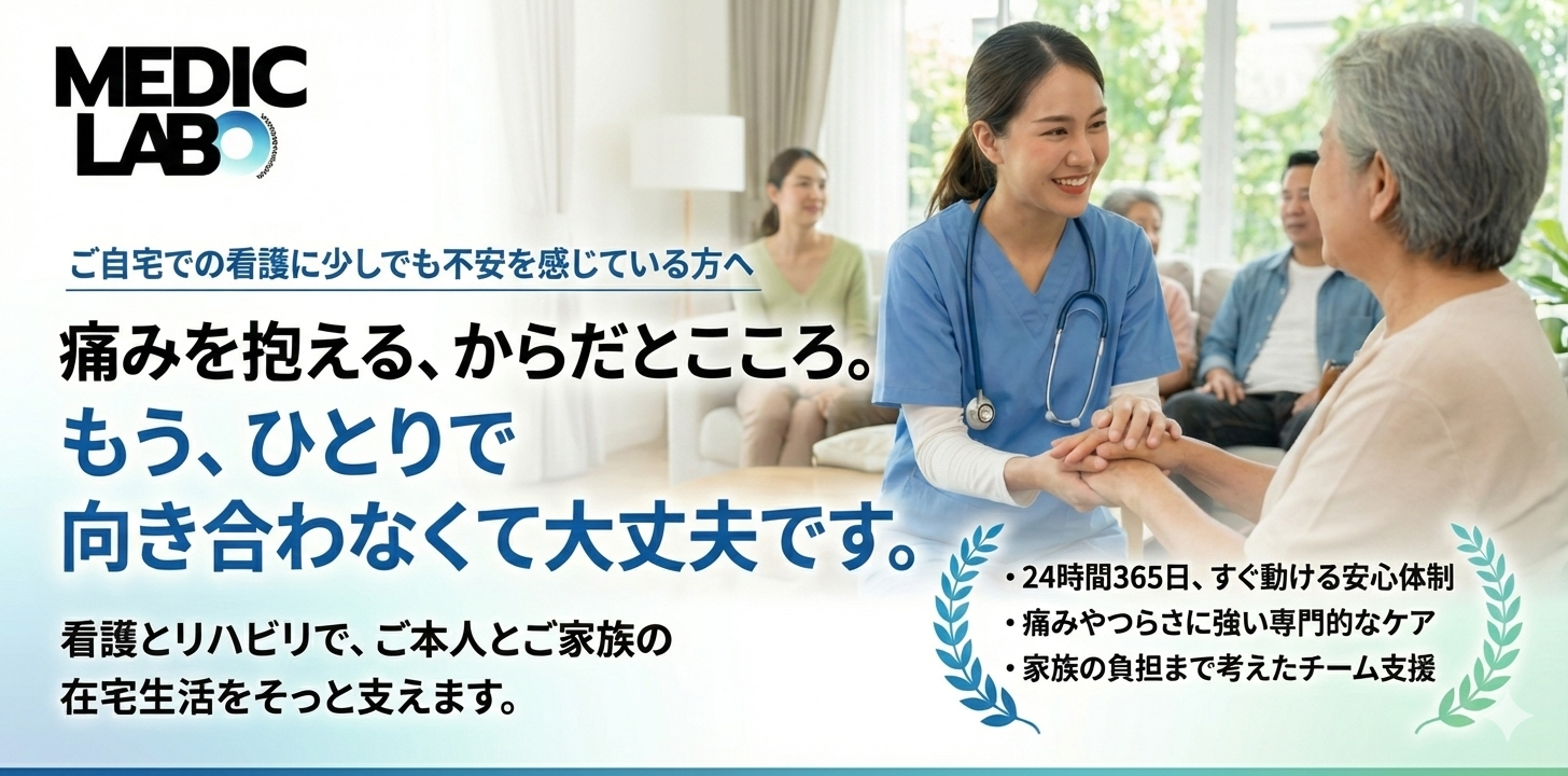メディックラボでは、看護師やリハビリ専門職がご自宅に伺い、医療ケアから日常のサポートまで幅広く対応します。